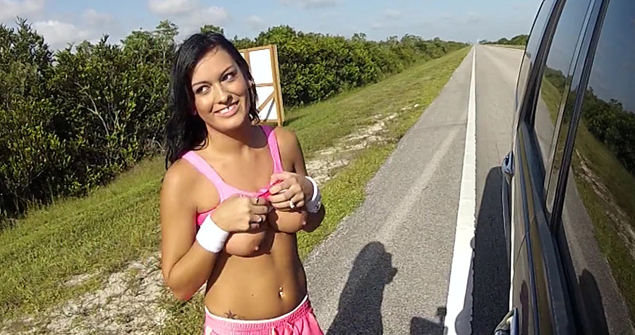 stranded teen nadia capri flashes her lovely boobs to get some help